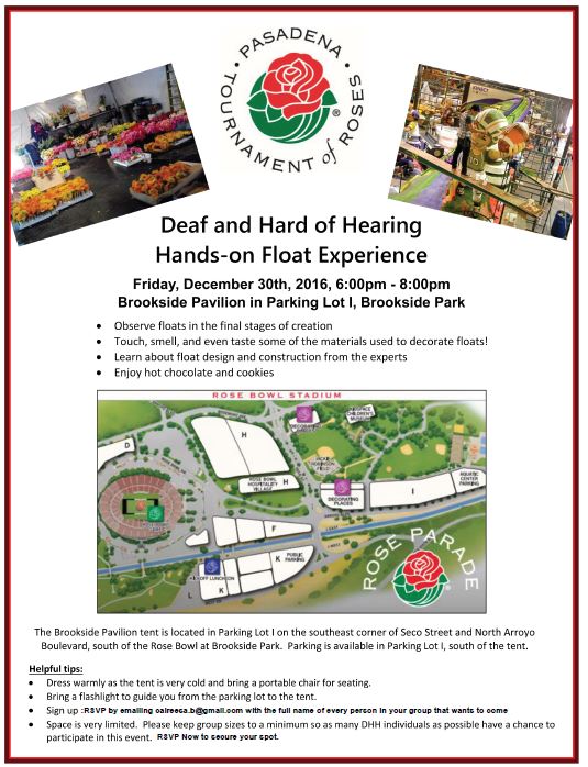 You are invited to attend the 2nd Annual Deaf and Hard of Hearing Tournament of Roses Float Viewing Event. RSVP by emailing caireesa.b@gmail.com to secure your spot, Use email subject title: RSVP D&HH TofR Float Viewing Event.