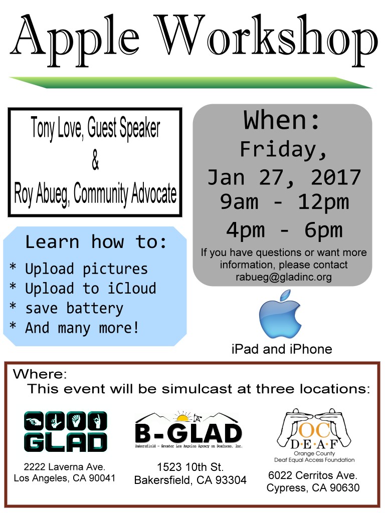 You will have opportunity to learn how to upload photos, upload to iCloud, save battery and more. This workshop will be simulcast at two other locations: GLAD and OCDEAF. Questions? Please contact Roy Abueg at rabueg@gladinc.org.