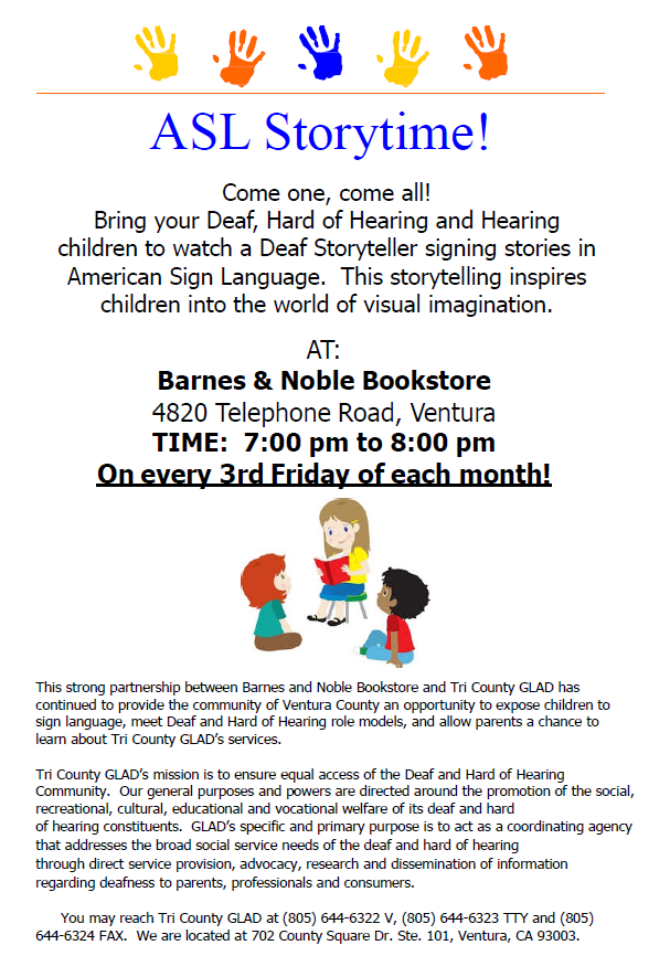 Bring your Deaf, Hard of Hearing and Hearing children to watch a Deaf Storyteller signing stories in American Sign Language. This storytelling inspires children into the world of visual imagination. This strong partnership between Barnes and Noble Bookstore and Tri County GLAD has continued to provide the community of Ventura County an opportunity to expose children to sign language, meet Deaf and Hard of Hearing role models, and allow parents a chance to learn about Tri County GLAD’s services. You may reach Tri County GLAD at info@tcglad.org, (805) 256-1053, (805) 644-6322 V, (805) 644-6323 TTY.