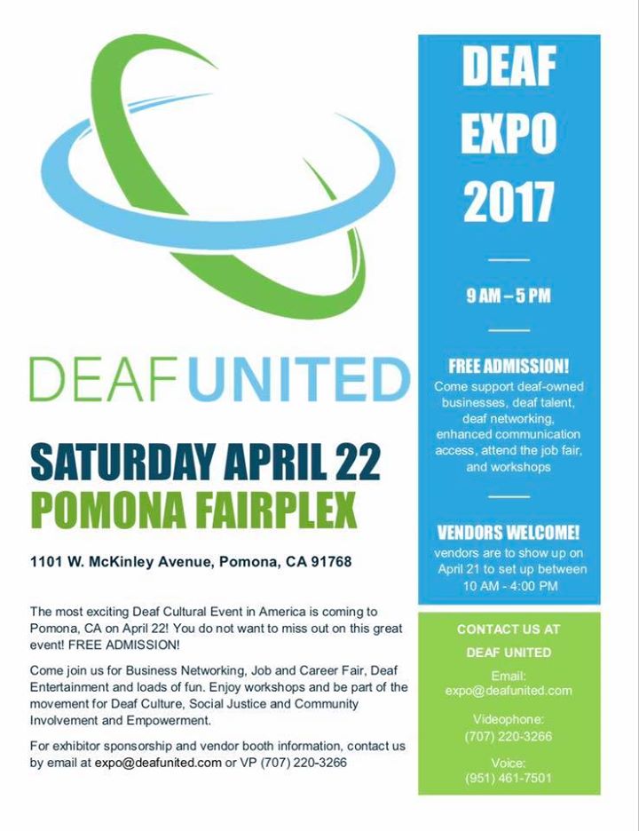 Deaf Expo is being hosted by Deaf United, (http://deafunited.com) and is on April 22, 2017 in Pomona, CA.