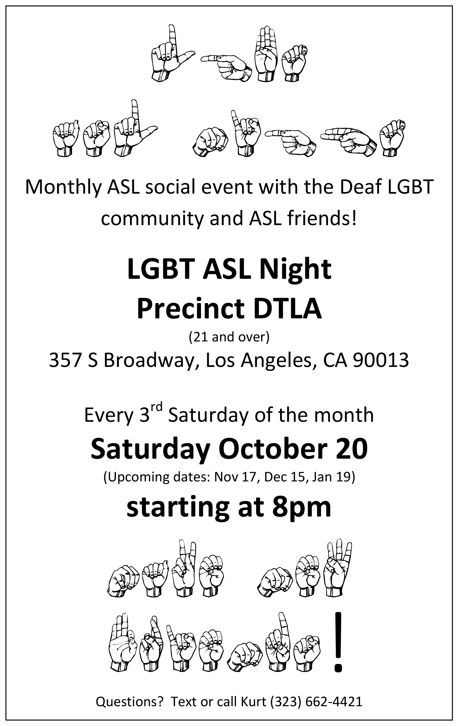Monthly ASL social event with the Deaf LGBT community and ASL friends!