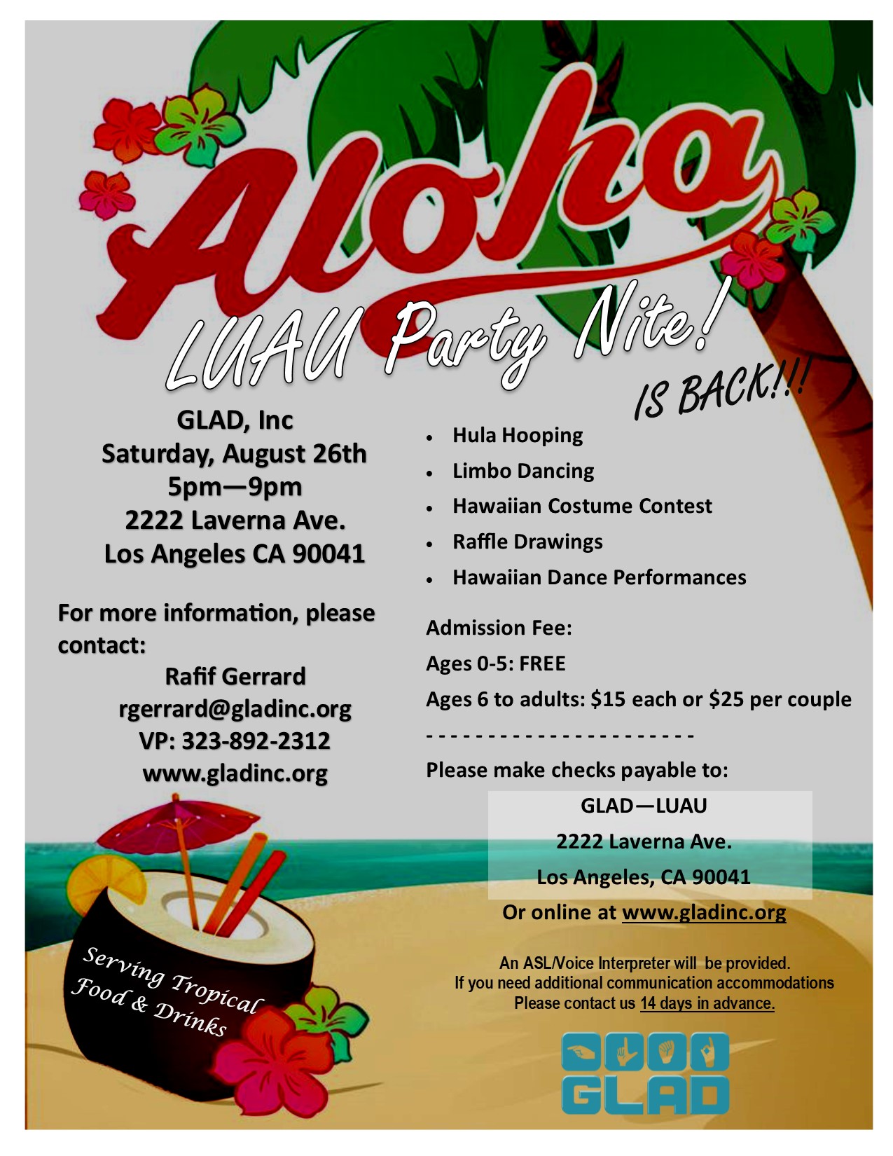 ALOHA! GLAD, Inc. is bringing back its Luau Party Nite! There will be hula hooping, limbo dancing, best Hawaiian costume contest, raffle drawings, and Hawaiian dance performances! There will be foods and drinks to enjoy. It will be on Saturday, August 26, 2017 from 5PM to 9PM at GLAD.
