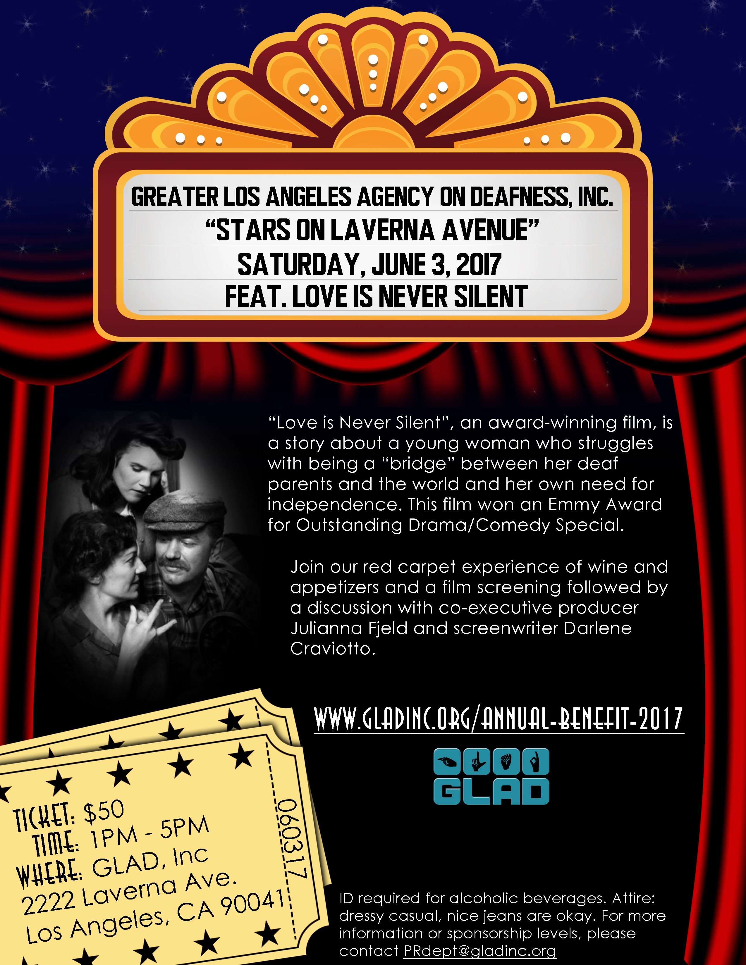GLAD, Inc. invites you on June 3, 2017 to our Stars on Laverna Avenue event, a red carpet experience featuring “Love Is Never Silent”, a film about a young woman who struggles with being a “bridge” between her deaf parents and the world and her own need for independence. This film won an Emmy Award for Outstanding Drama/Comedy Special.